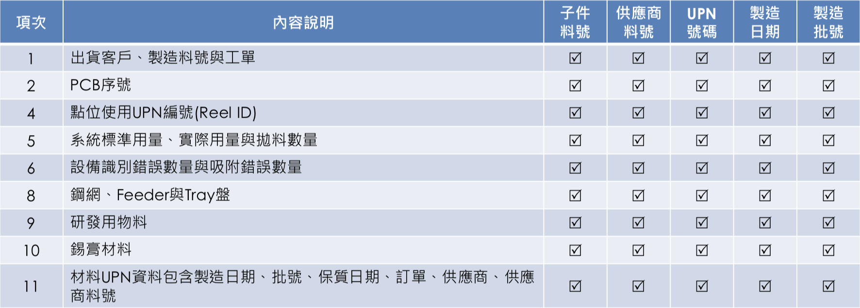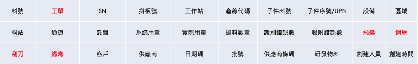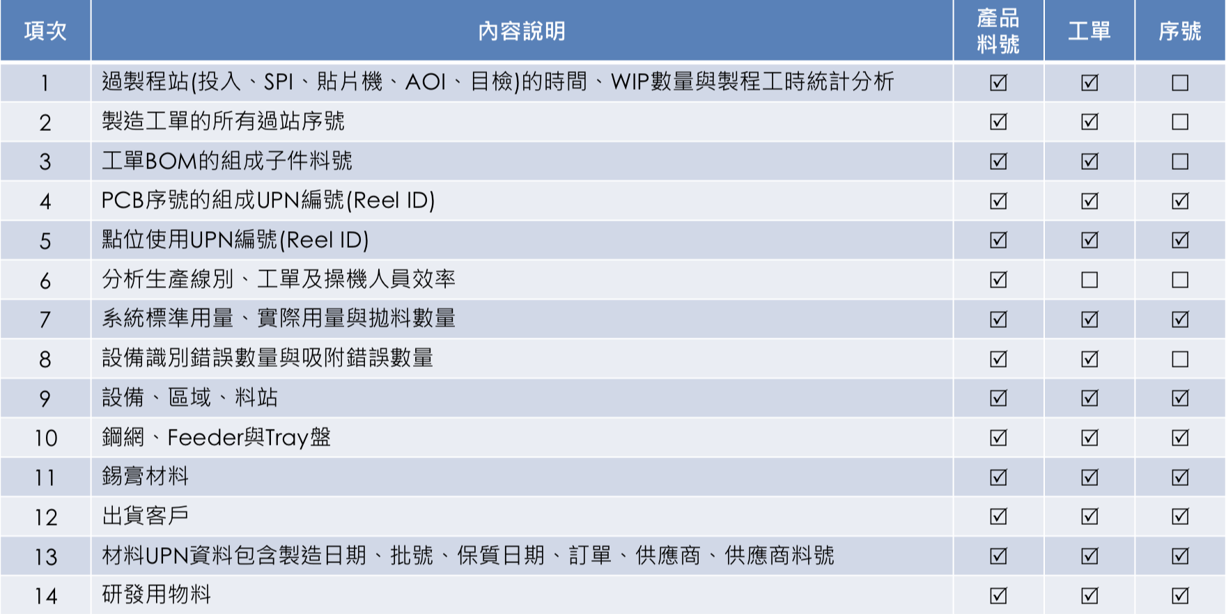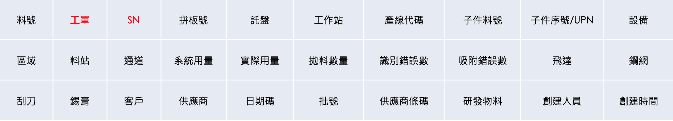 正向追溯:依據工單追溯 , SN(PCBA)追溯 , 料號追溯可追溯下列資料 :