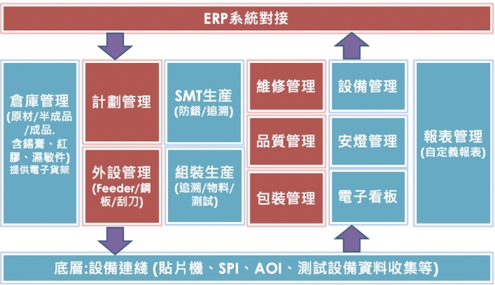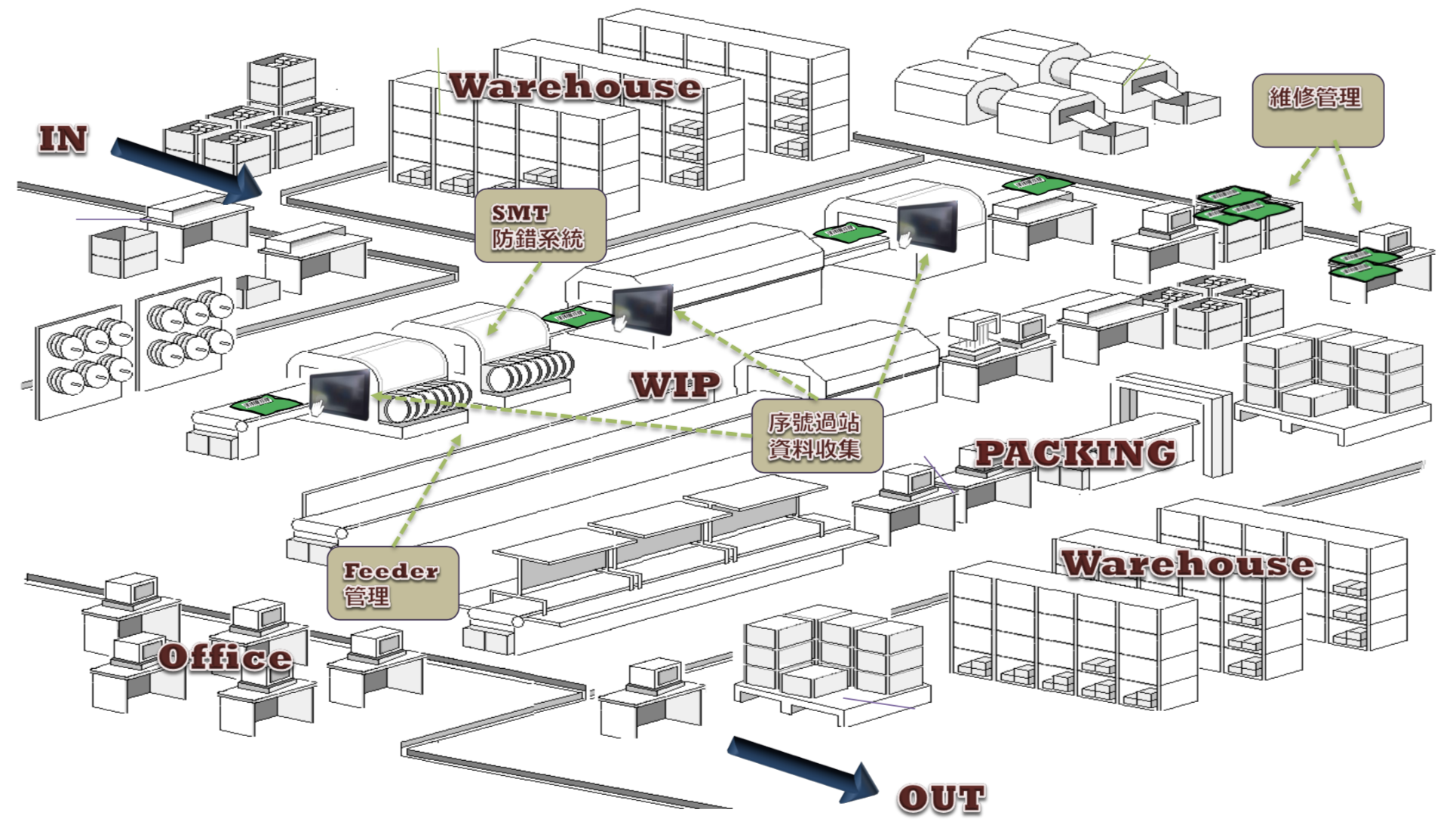 本公司為增進生產效率及品質,特別導入MES置造管制系統(Manufacturing Execution systen)也稱為Shop Floor control 該系統包含了智能倉庫管理,防錯料管理及生產品質與維修管理等,使本公司縮短了備料、上料換線之時間,使生產更有效率,也可以管理追朔產品的生產及維修過程,使產品及物料的管理更智慧化、系統化,更重要的是以電腦進行稽核每一段製程的品質,確保產品生產的品質的真實性及一致性,以滿足客戶對嚴苛可信賴度產品的要求。